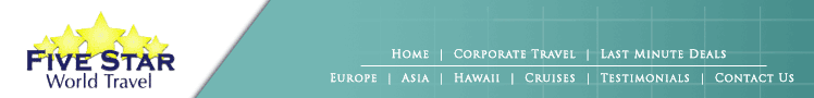 Five Star World Travel has been serving our clientele since 1997. We are dedicated to providing the highest level of service and offer the most competitive rates. Corporate customers can easily book their travels through our website. Our experienced Travel Consultants are also available seven days a week to address all of your travel needs.